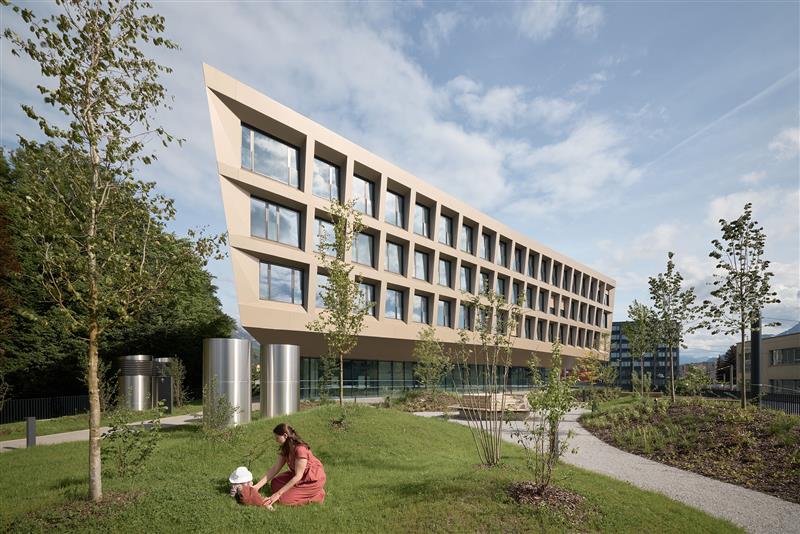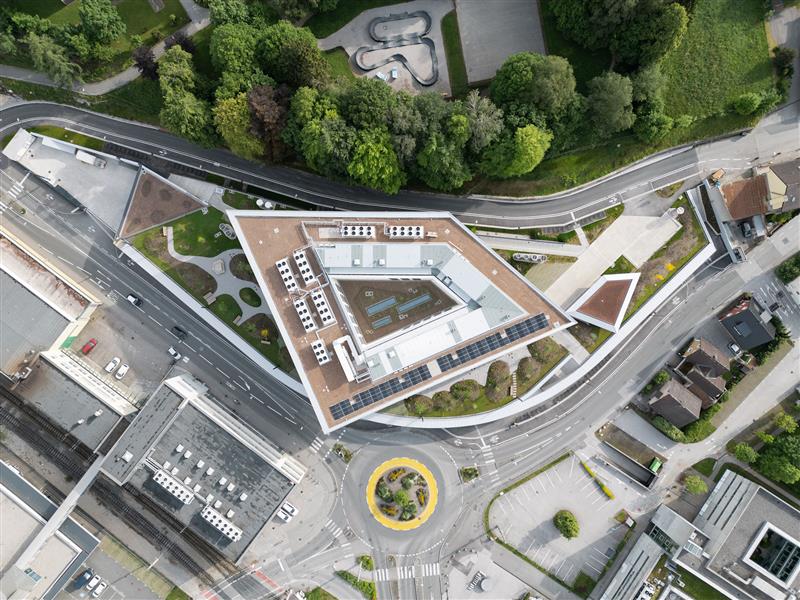 Darüber thronen drei schwebende Bürogeschosse mit geneigten Fassaden, die markante Blickachsen und eine besondere Dynamik schaffen. Nachhaltigkeit spielte bei der Umsetzung eine zentrale Rolle: hochwertige Materialien, eine Photovoltaik-Anlage mit 30.000 kWh Eigenstrom sowie 250 Fahrradabstellplätze setzen klare Zeichen. Alle Pkw-Stellplätze verschwinden in der Tiefgarage, wodurch der öffentliche Raum ganz den Menschen vorbehalten bleibt. Mit den Geschäften im Erdgeschoss wird zudem die Nahversorgung des gesamten Umfelds sichergestellt – von der Goethesiedlung über das Techno-Z bis hin zum Norden Salzburgs.