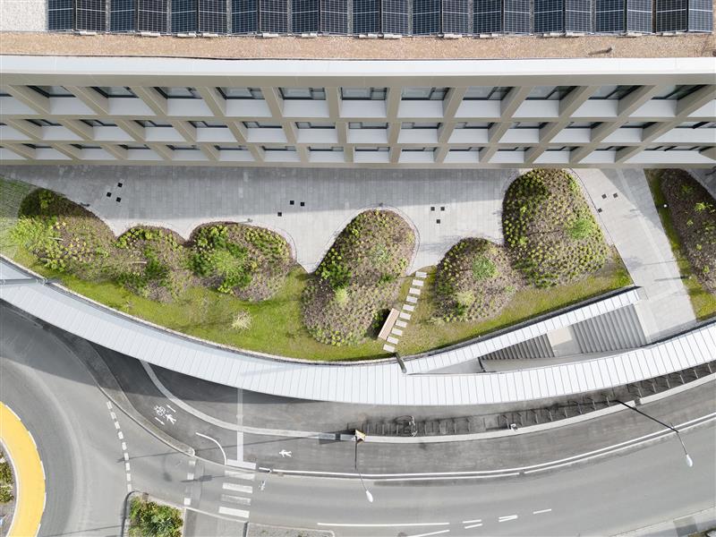 Bewusst an der Grenze der Elisabethvorstadt zu Bergheim gesetzt, wurde das Projekt als architektonisches Landmark im Stadtraum konzipiert. Auf Straßenniveau prägt ein fast 200 Meter langer gläserner Schwung die Dynamik der Raiffeisenstraße. Im ersten Obergeschoss sorgt eine großzügige Landschaftsterrasse mit 40 Bäumen und 2.000 Büschen nicht nur für ein grünes Dach, sondern auch für die Verbindung zur benachbarten Goethesiedlung. Gleichzeitig verknüpft diese Ebene die Eingänge, Fuß- und Radwege miteinander.