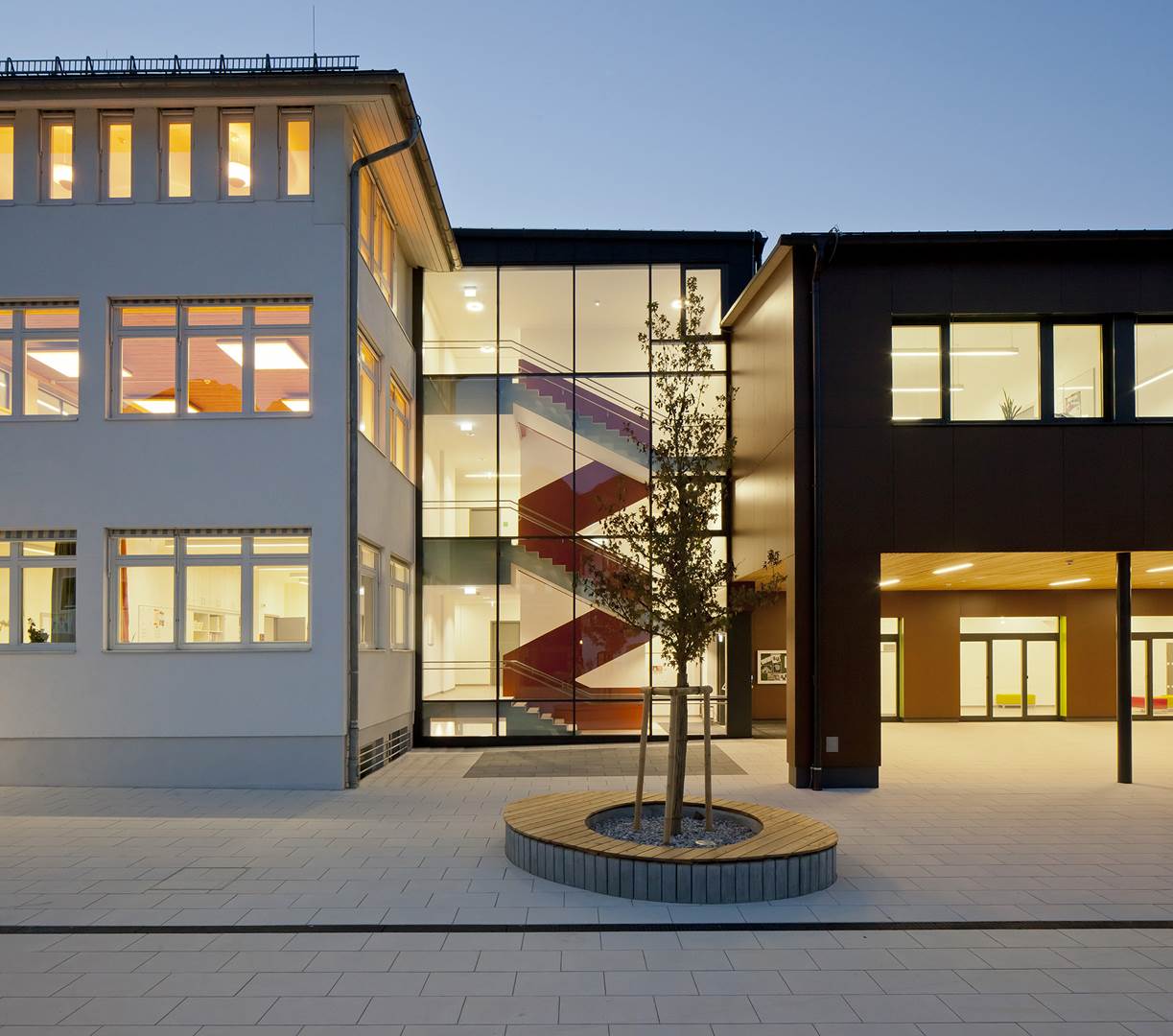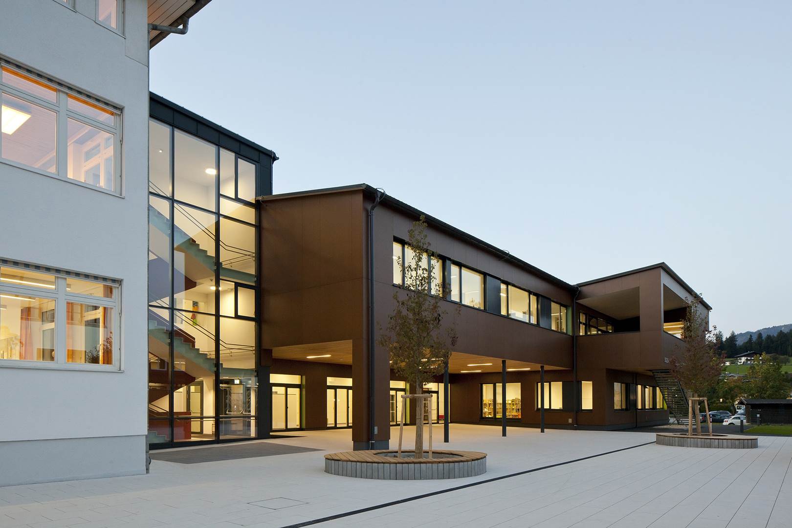 Das Projekt begann mit dem Abriss eines alten Gebäudes und mit dem Herstellen der Bodenplatte für das neue. Diese Arbeiten inklusive der Umlegung des Kanals fanden außerhalb der Schule statt und waren deshalb während des laufenden Betriebes gar kein Problem. Die geräuschintensiven Aufgaben hingegen konnten wir erst ab Mittag bzw. nach Unterrichtsschluss erledigen. Teilweise taten wir das sogar in Doppelschichten. Bei den eigentlichen Umbauarbeiten konzentrierten wir uns auf die Oster- und Sommerferien. Wobei ein Highlight der Bau des Stiegenhauses in aufwendiger Sichtbetonbauweise war, freitragend und außen komplett verglast. Darüber hinaus haben wir den Außenbereich mit Nebengebäuden, besseren Zugängen, Fahrradabstellplätzen und Außenspielgeräten neu geordnet. Quasi als Draufgabe galt es noch, den Erdöltank der alten Heizung aus dem Boden zu holen, für den wir sogar einen Nachnutzer fanden. Fazit: Wir haben unsere Hausaufgaben gemacht, weshalb seit 2014 die Schülerinnen und Schüler in Abtenau in einer Schule lernen, die alle Stücke spielt.