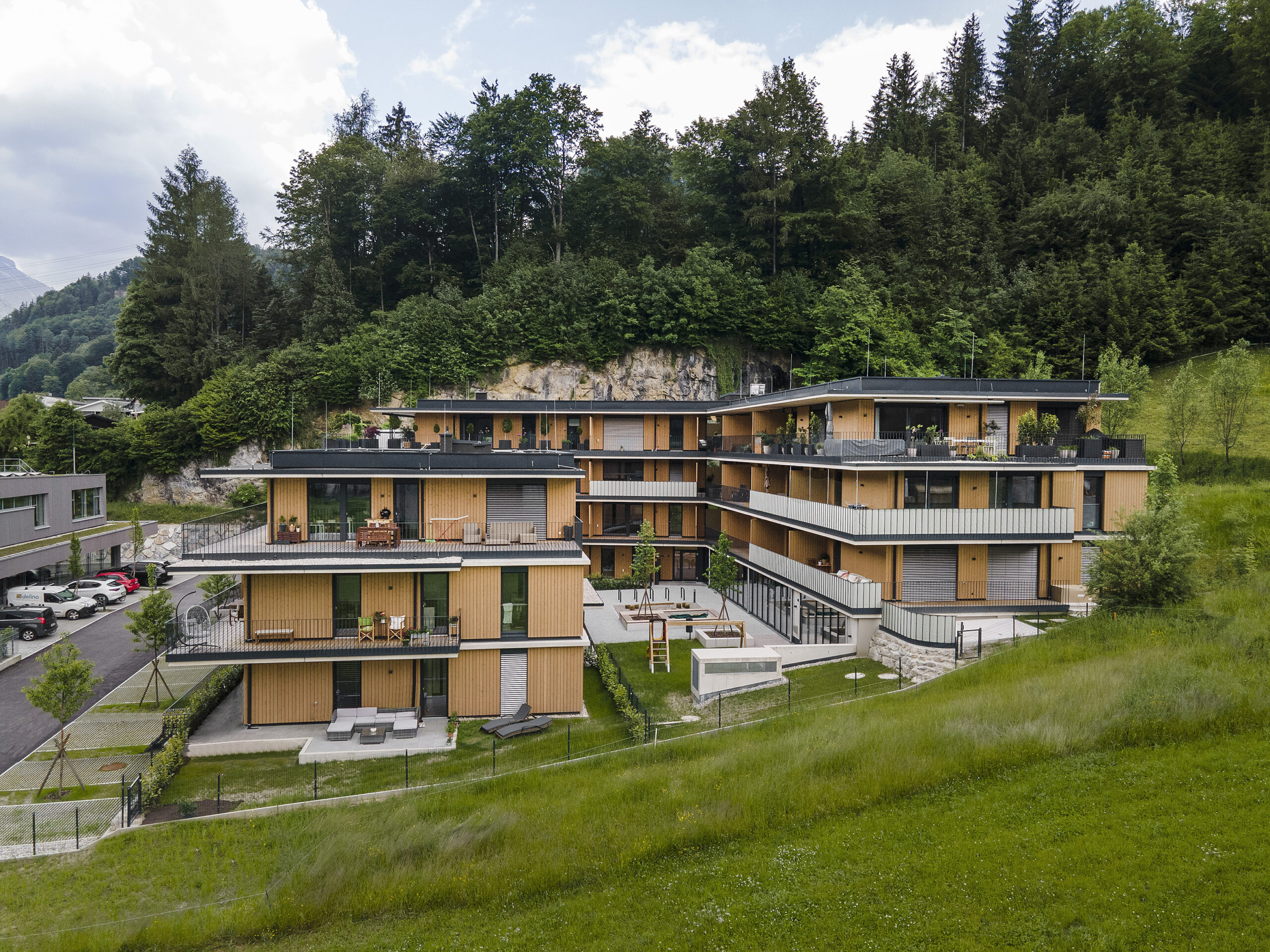 Das Projekt erzählt die Geschichte eines Ortes im Wandel: Wo früher ein Steinbruch genutzt wurde, entstanden nun zwei Baukörper mit 29 Wohneinheiten. Haus 1 entwickelt sich aus der natürlichen Topographie und nutzt die bestehende Stützmauer als Rückwand für den Fahrradraum sowie den Gemeinschaftsraum mit Terrasse. Haus 2 schließt das Grundstück nach Südwesten ab und erlaubt durch seine kleinere Proportion gleichzeitig großzügige Ausblicke in die umliegende Berglandschaft.