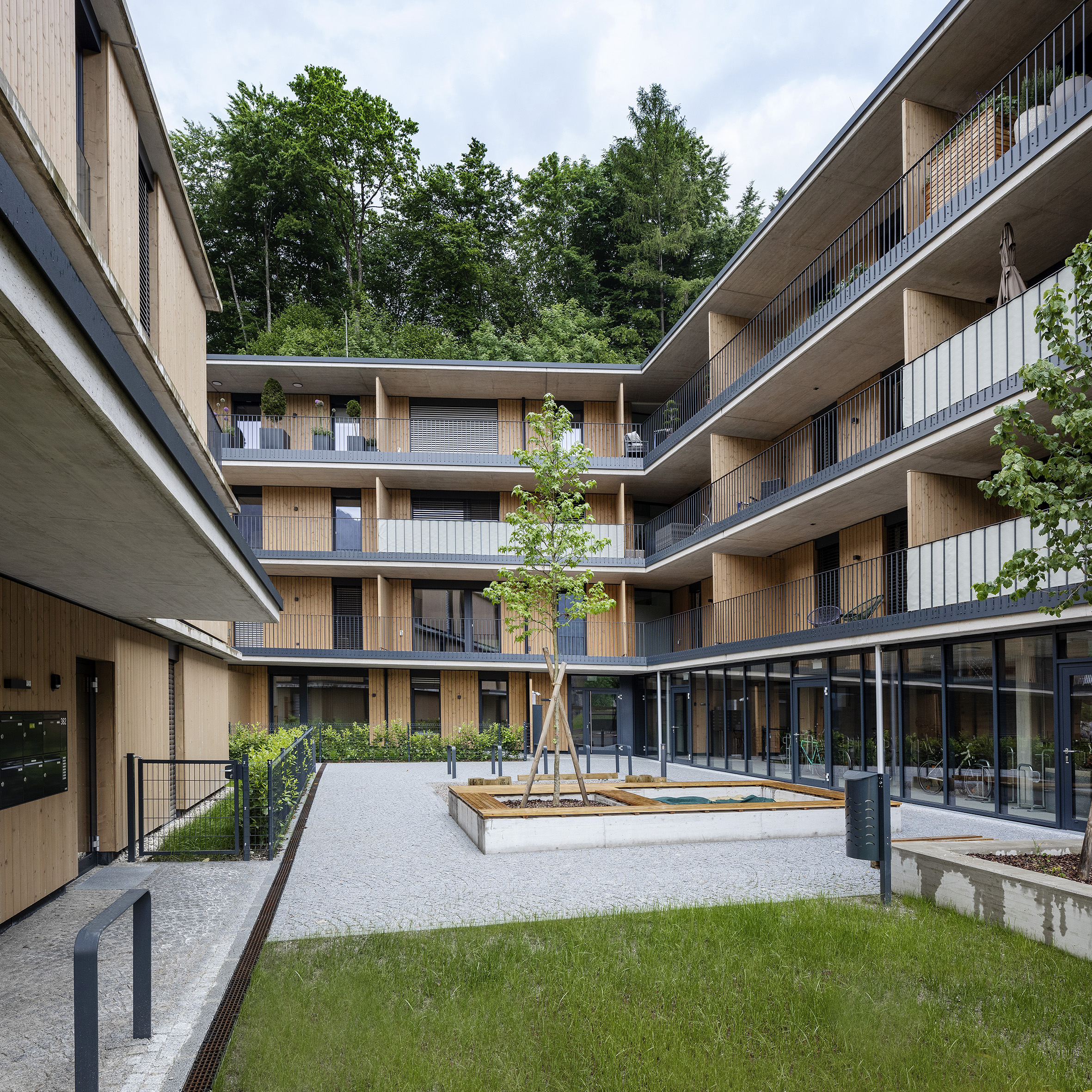 Zwischen den beiden Baukörpern liegt ein kleiner Hof mit gemeinschaftlichen Einrichtungen, die bewusst auf Begegnung und Nachbarschaft ausgerichtet sind. Besonders eindrucksvoll inszeniert wird die bestehende Felswand: Sie erinnert an die frühere Nutzung als Steinbruch und wird durch die großzügige Verglasung des Laubengangs beim Zugang zu den Wohnungen erlebbar gemacht. Ein Projekt, das die Geschichte des Ortes bewahrt und zugleich hochwertigen Wohnraum schafft.